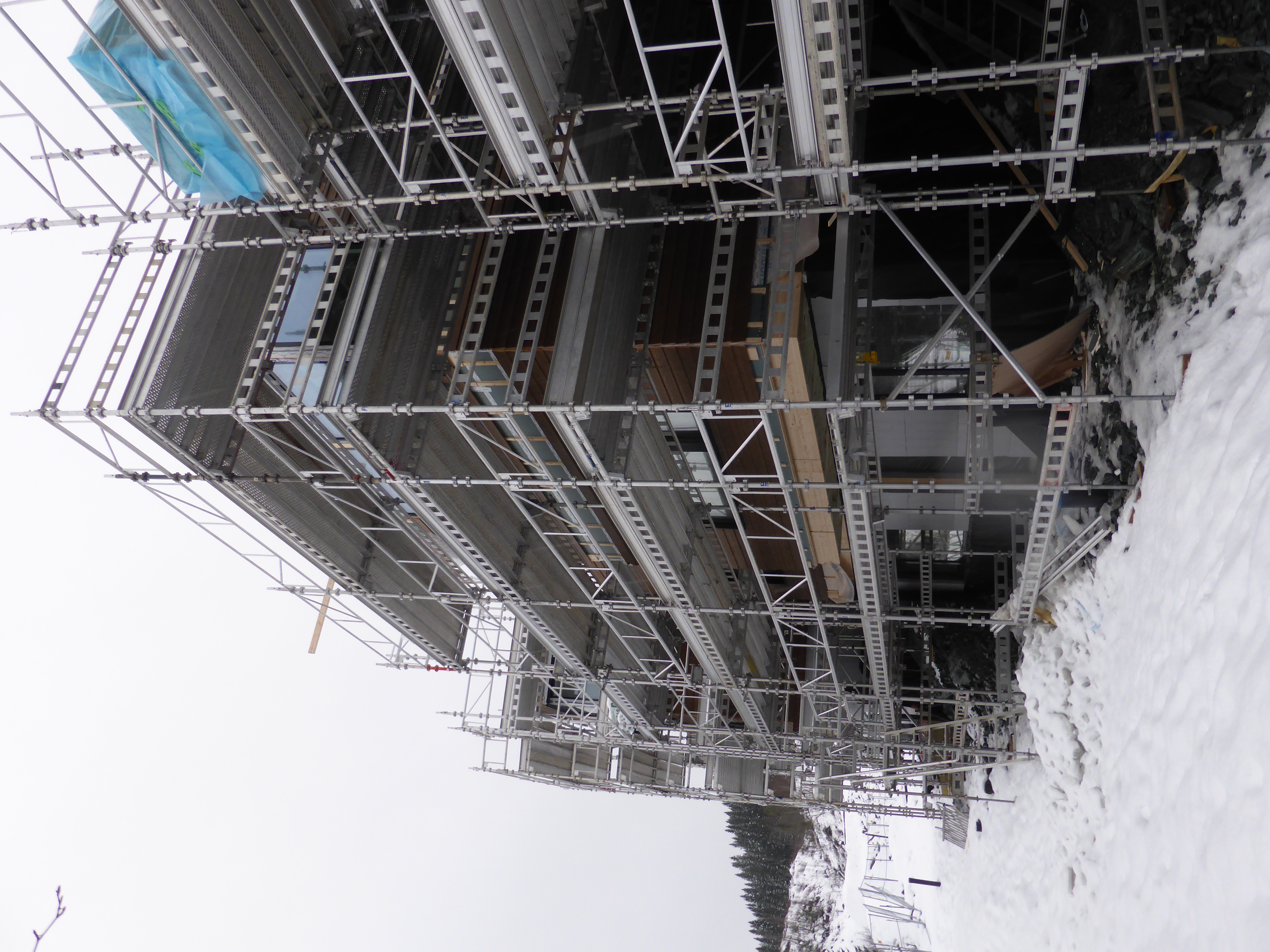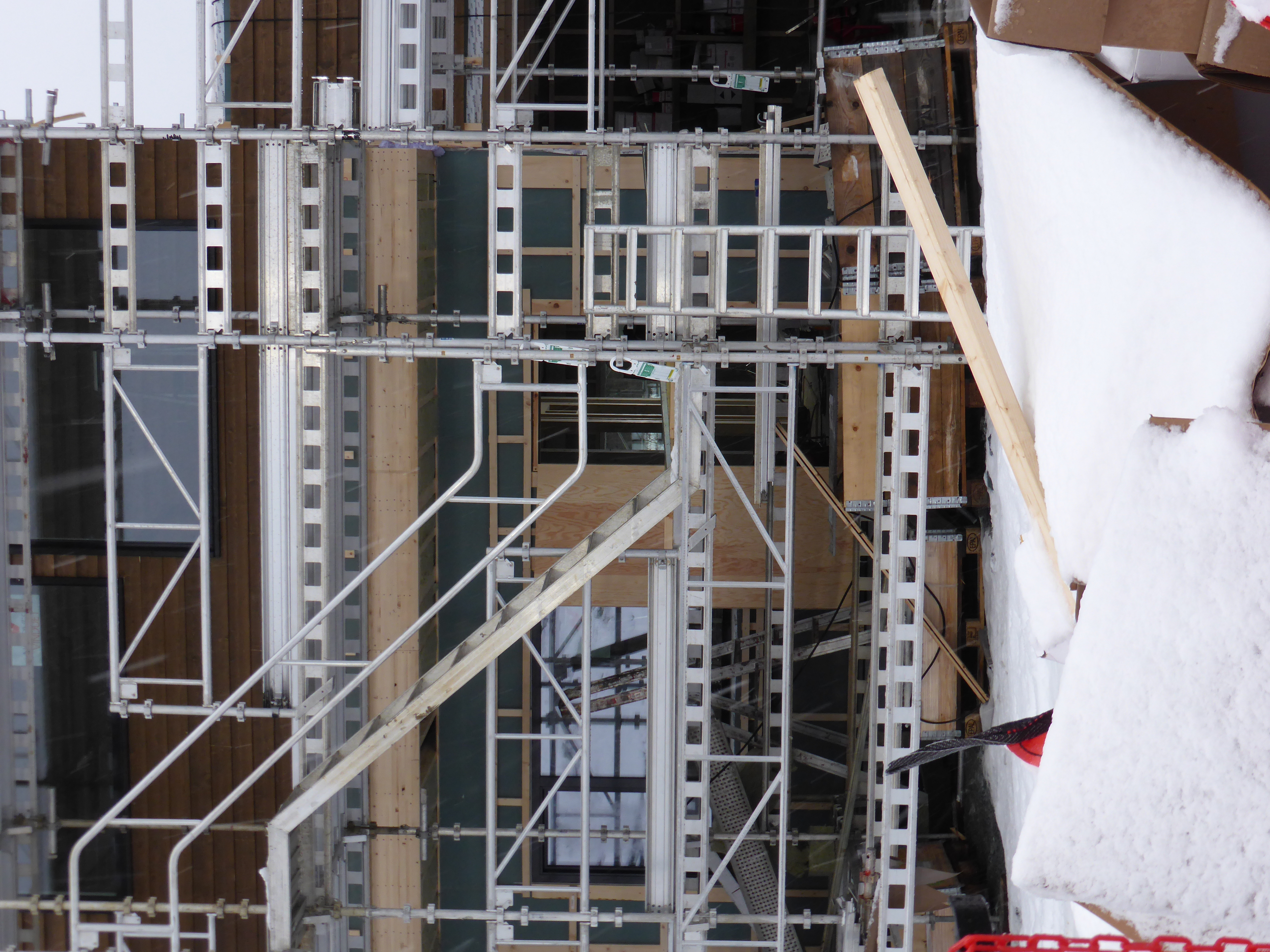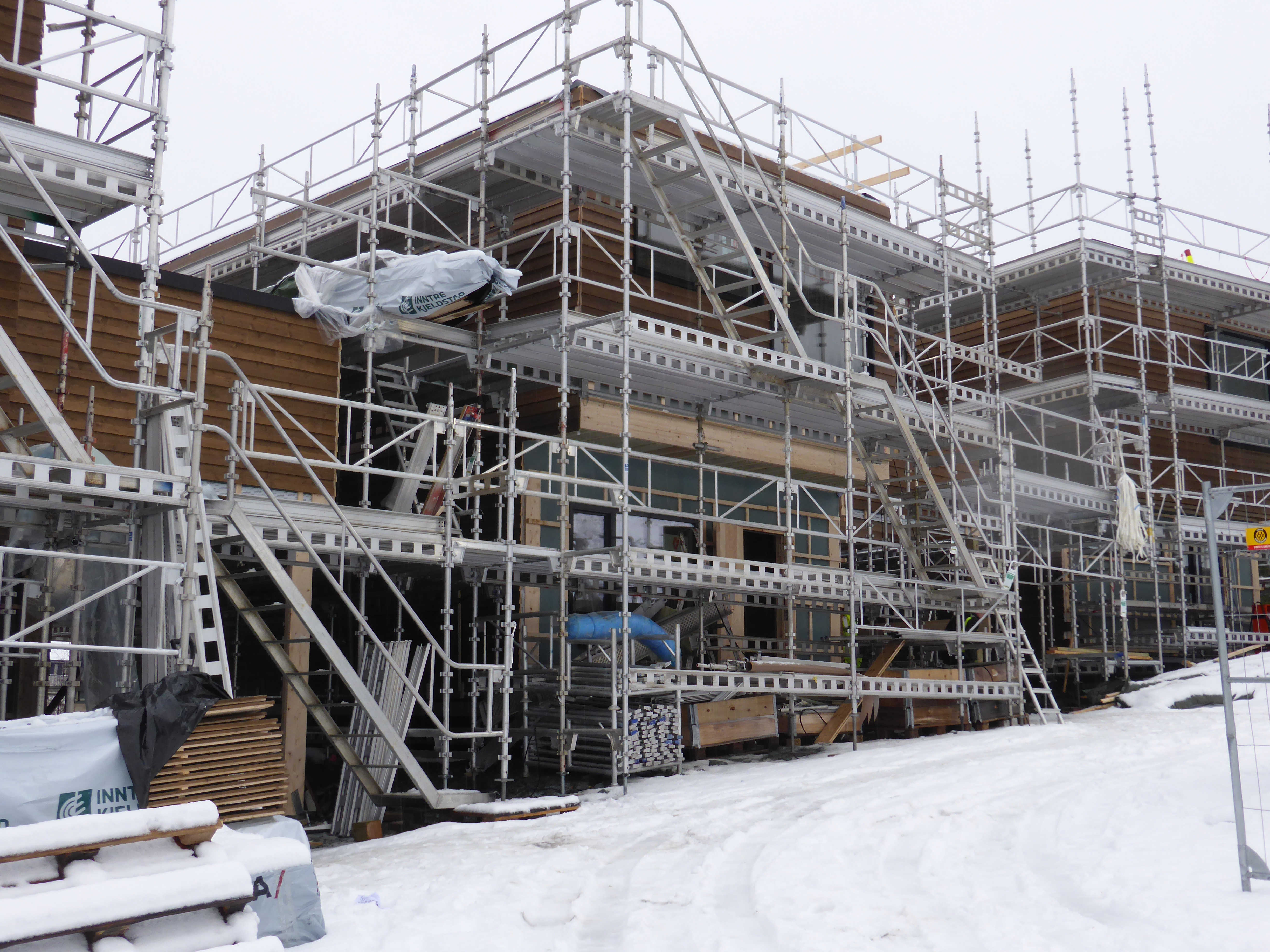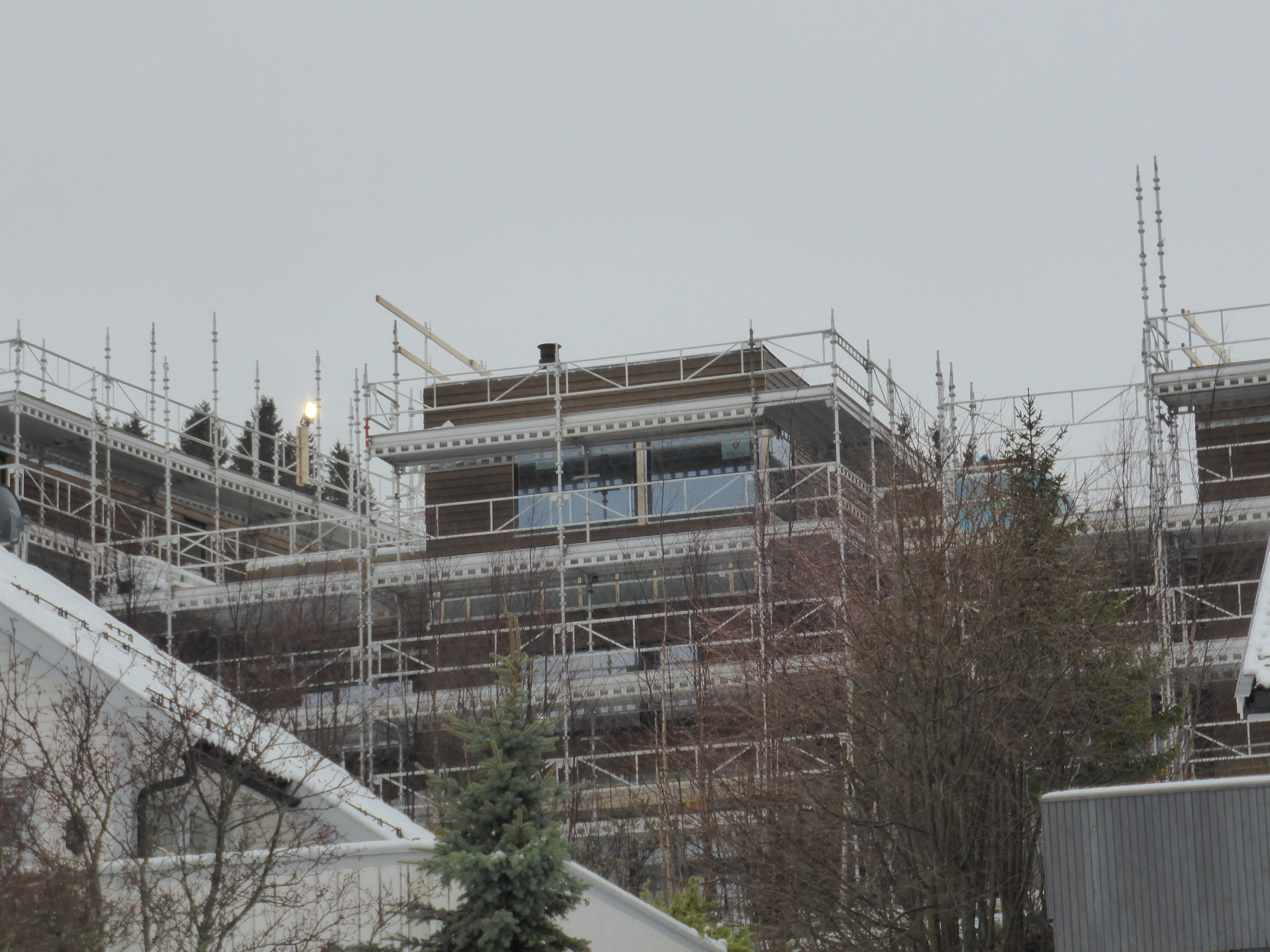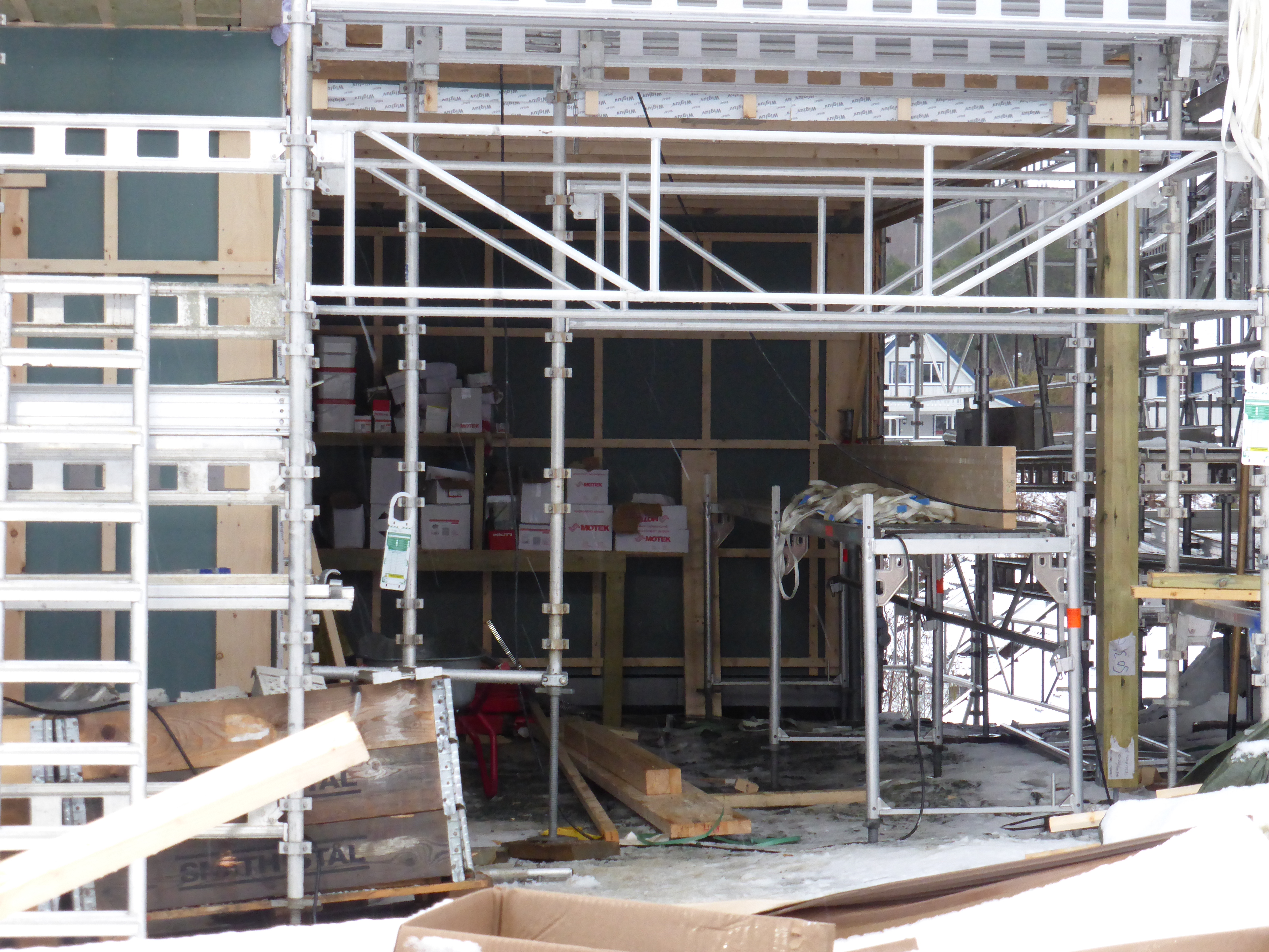 4 kledningsbord langs hele nordveggen. Spionasje gjennom ytterdøra: Så ramme rundt dør til bad. Noe slags møte pågående (med elektriker?)