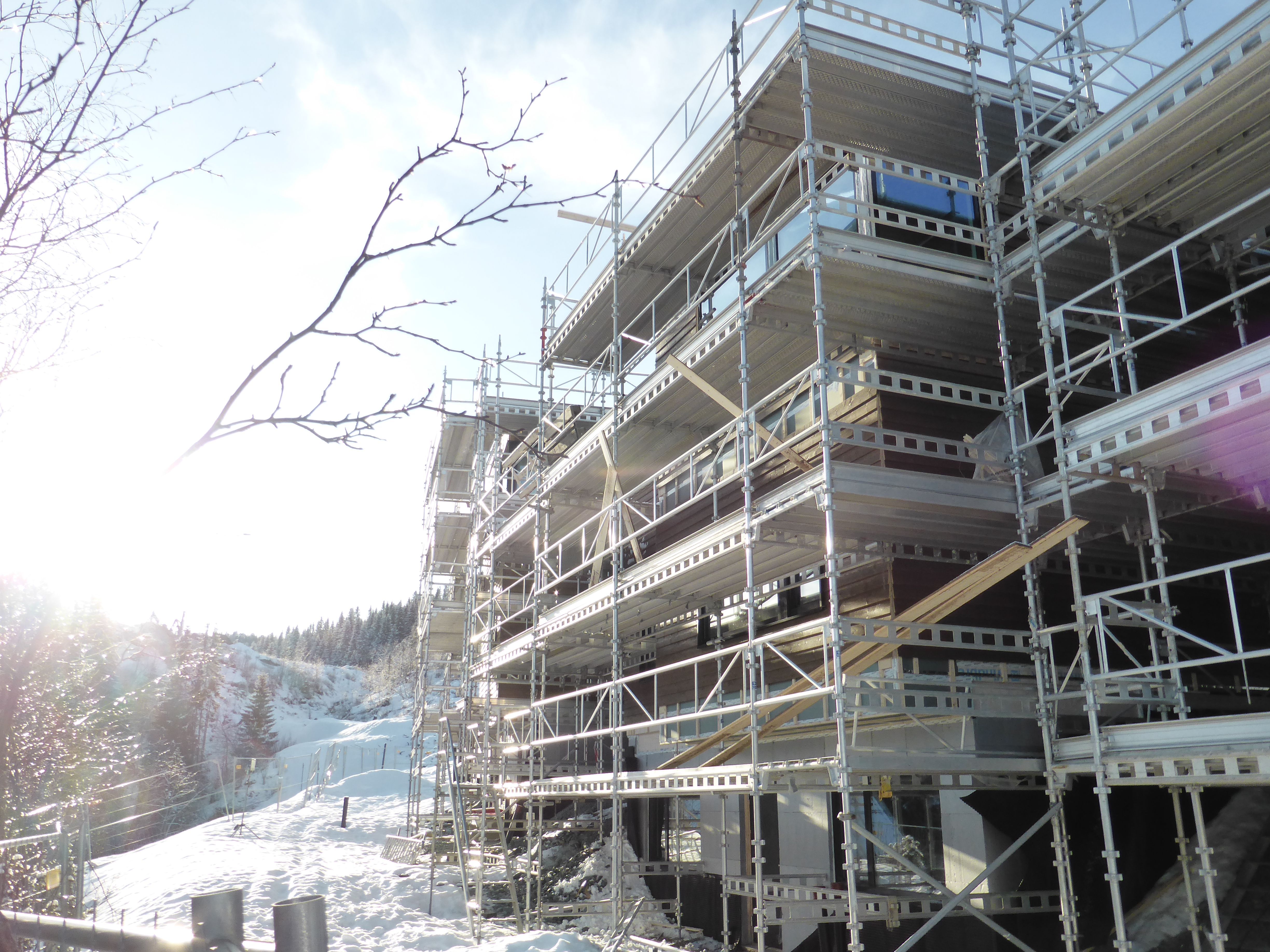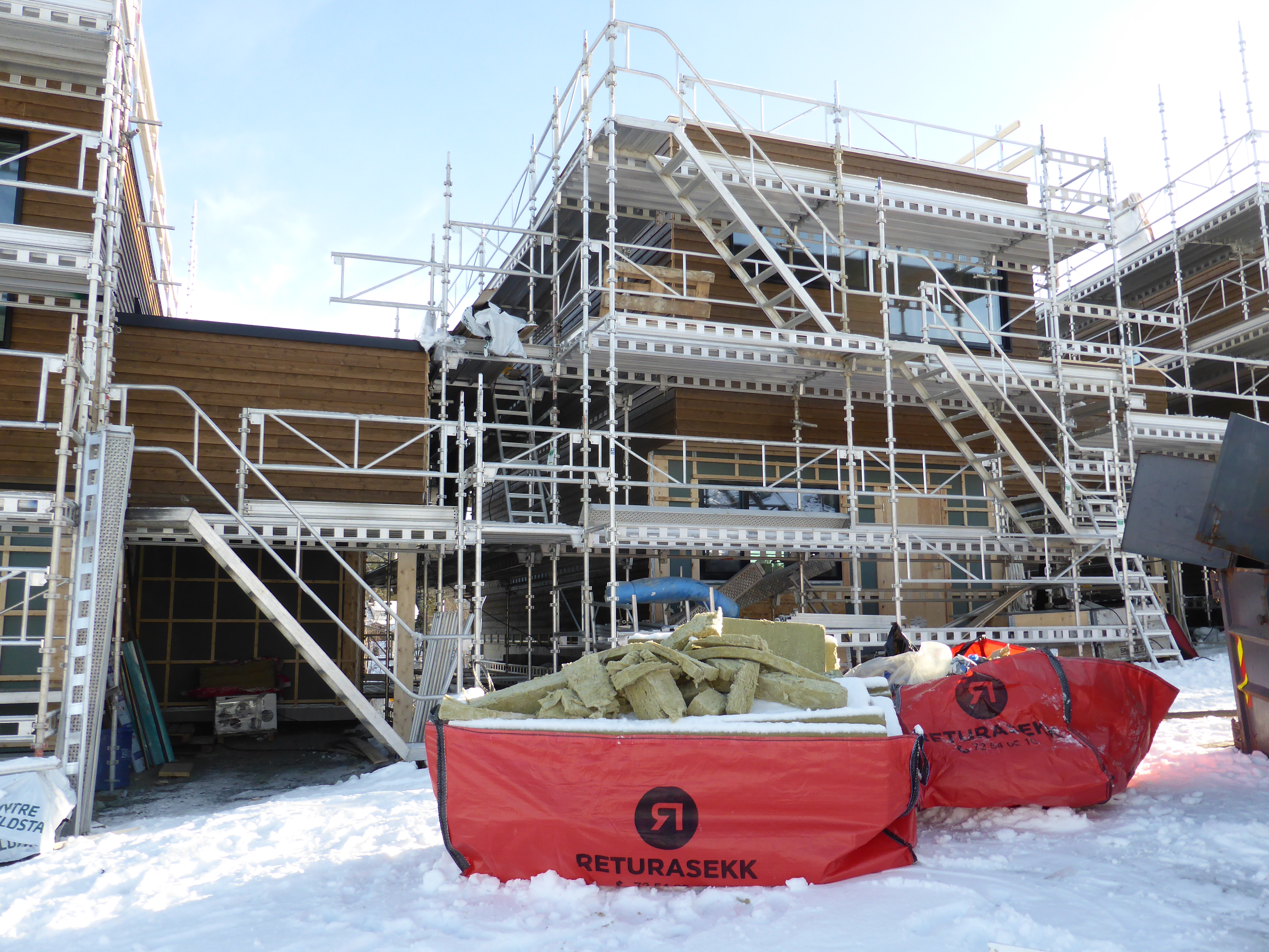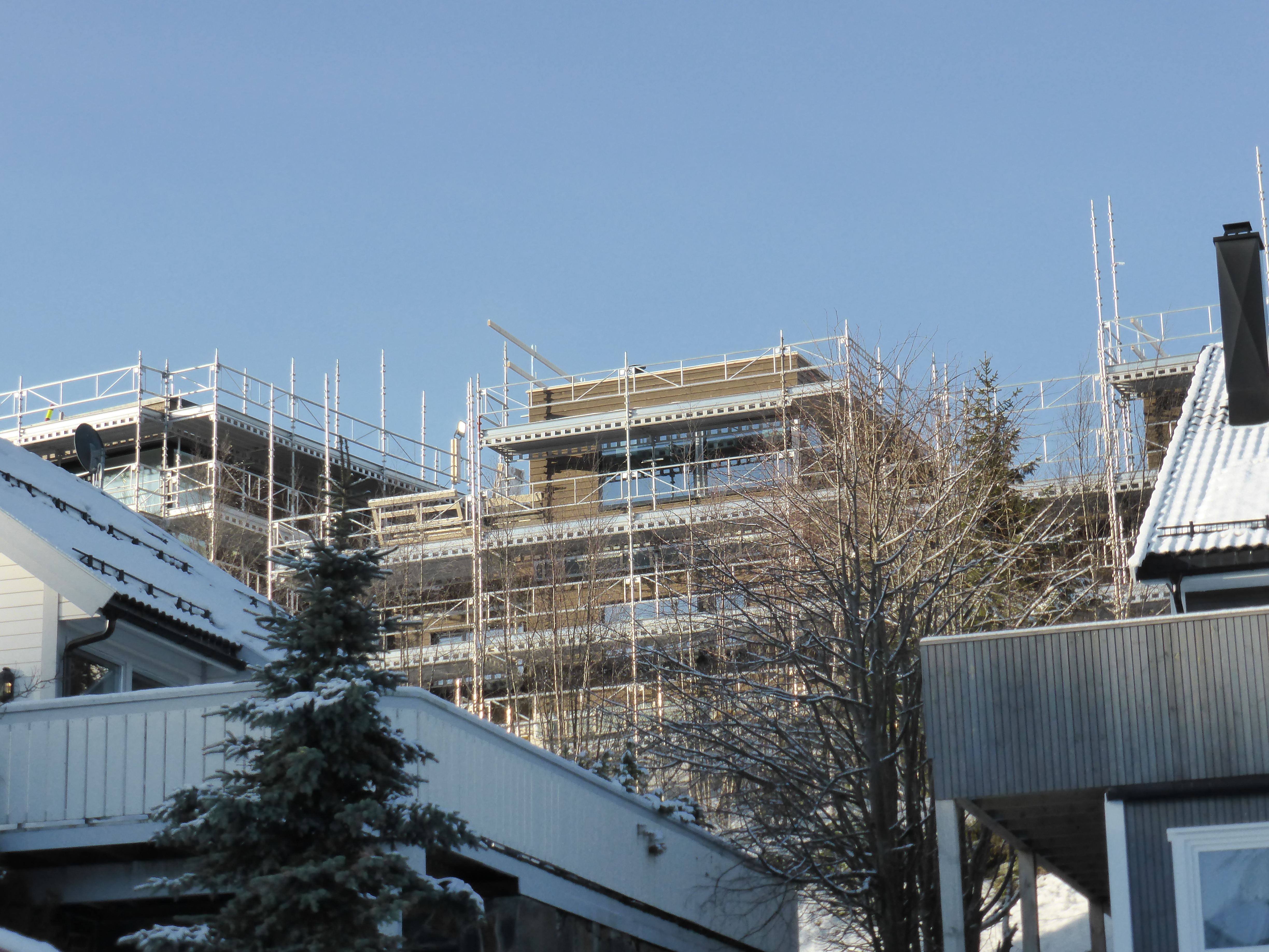 Kledning på utstikket over ytterdøra. Folk som holder på inne til tider