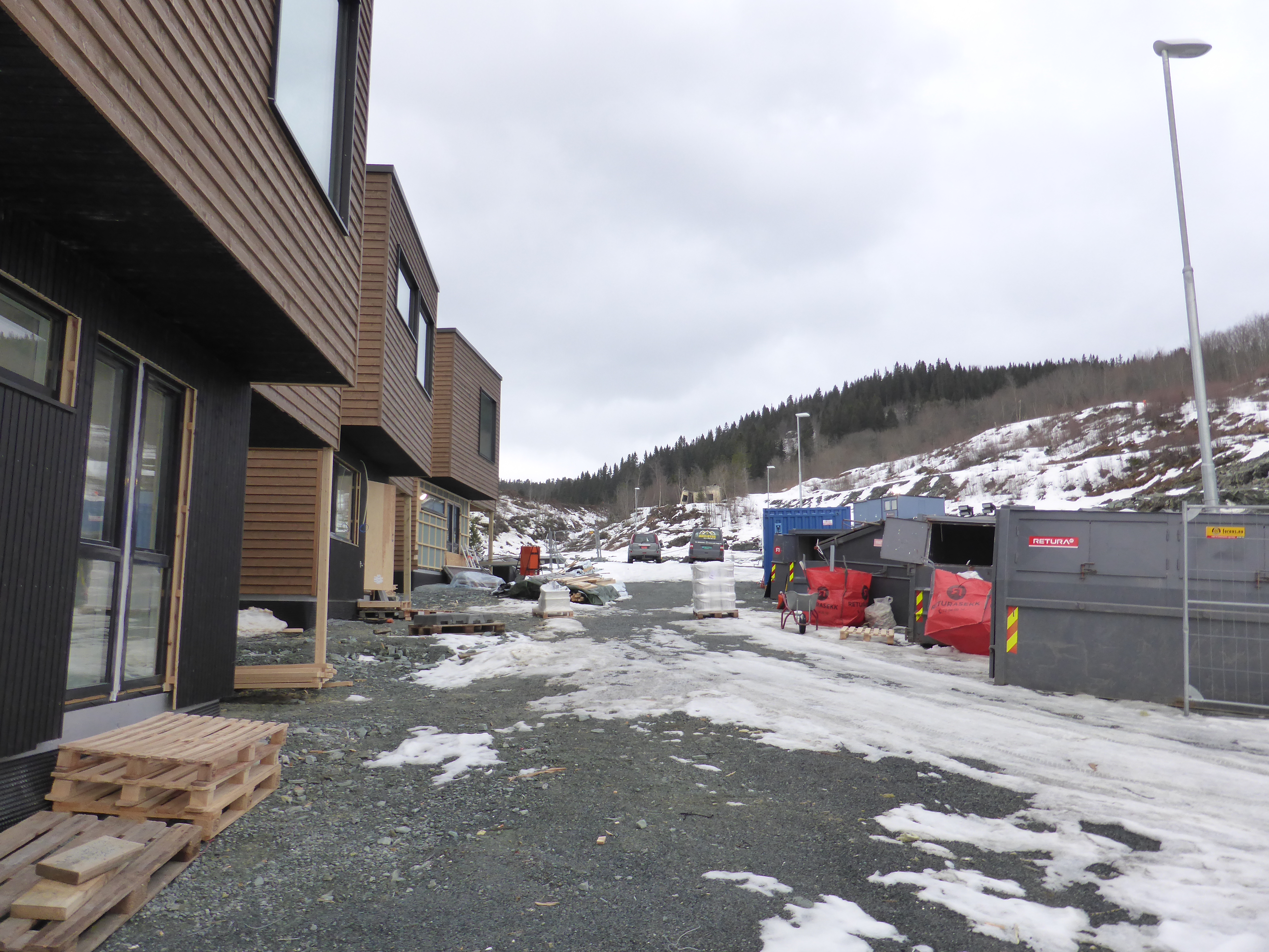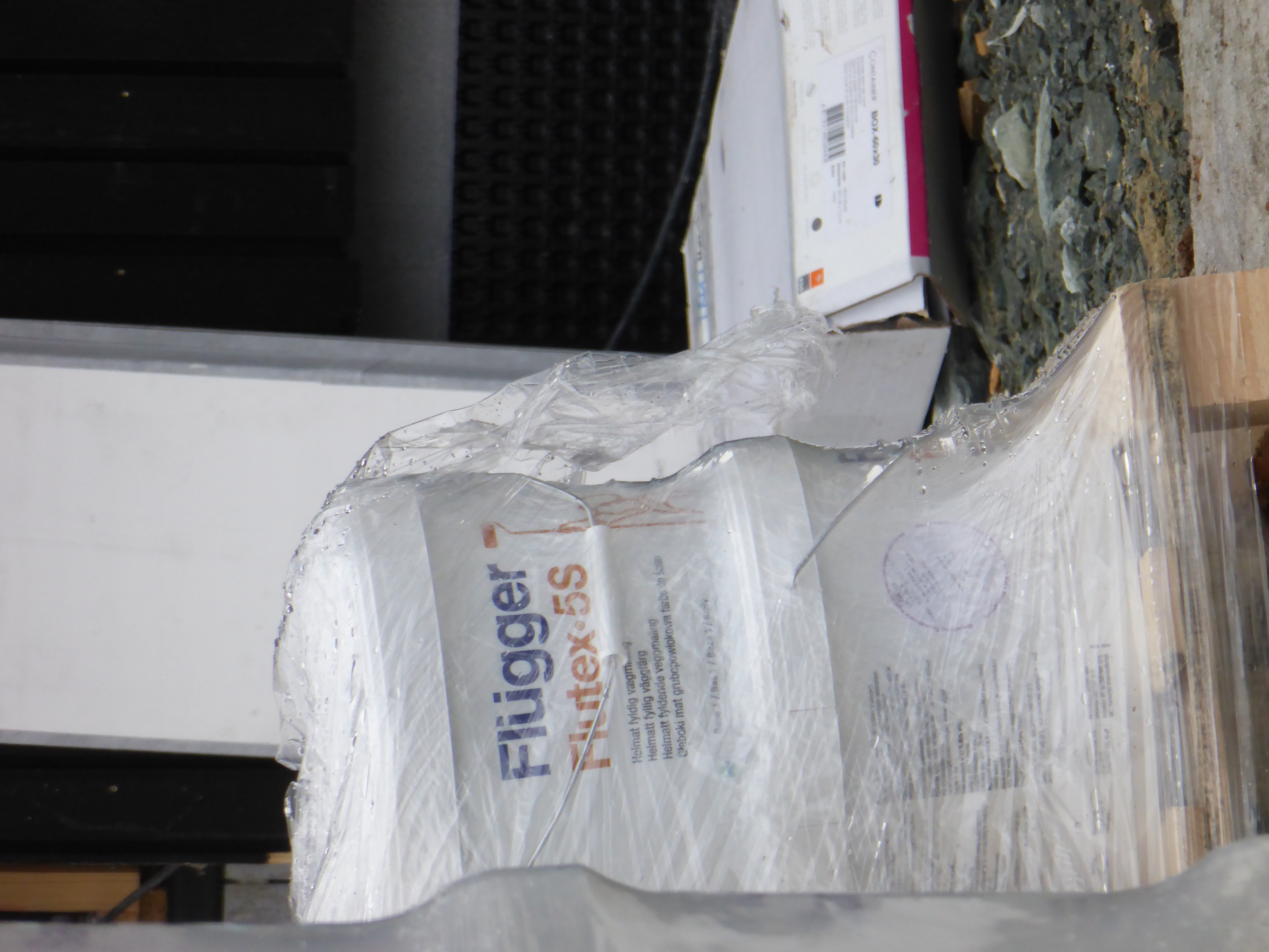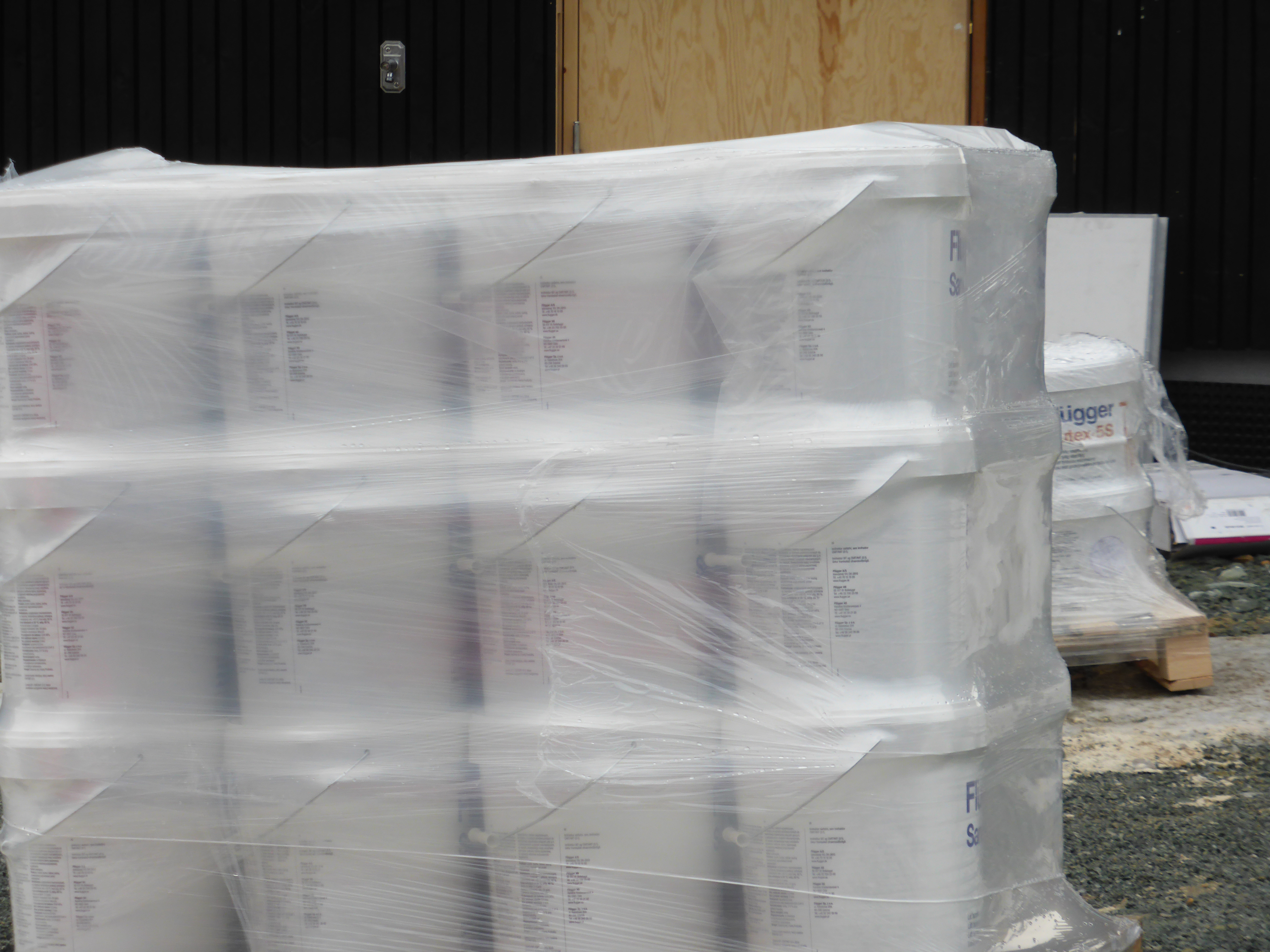 Lukka døra for kjapt til at jeg klarte se noe inn i dag, men det kom en ut og vaska av en bøtte så virka som flislim på gang Leveranse av pall med ca 33 spann sparkel + en liten pall med maling og noe utstyr