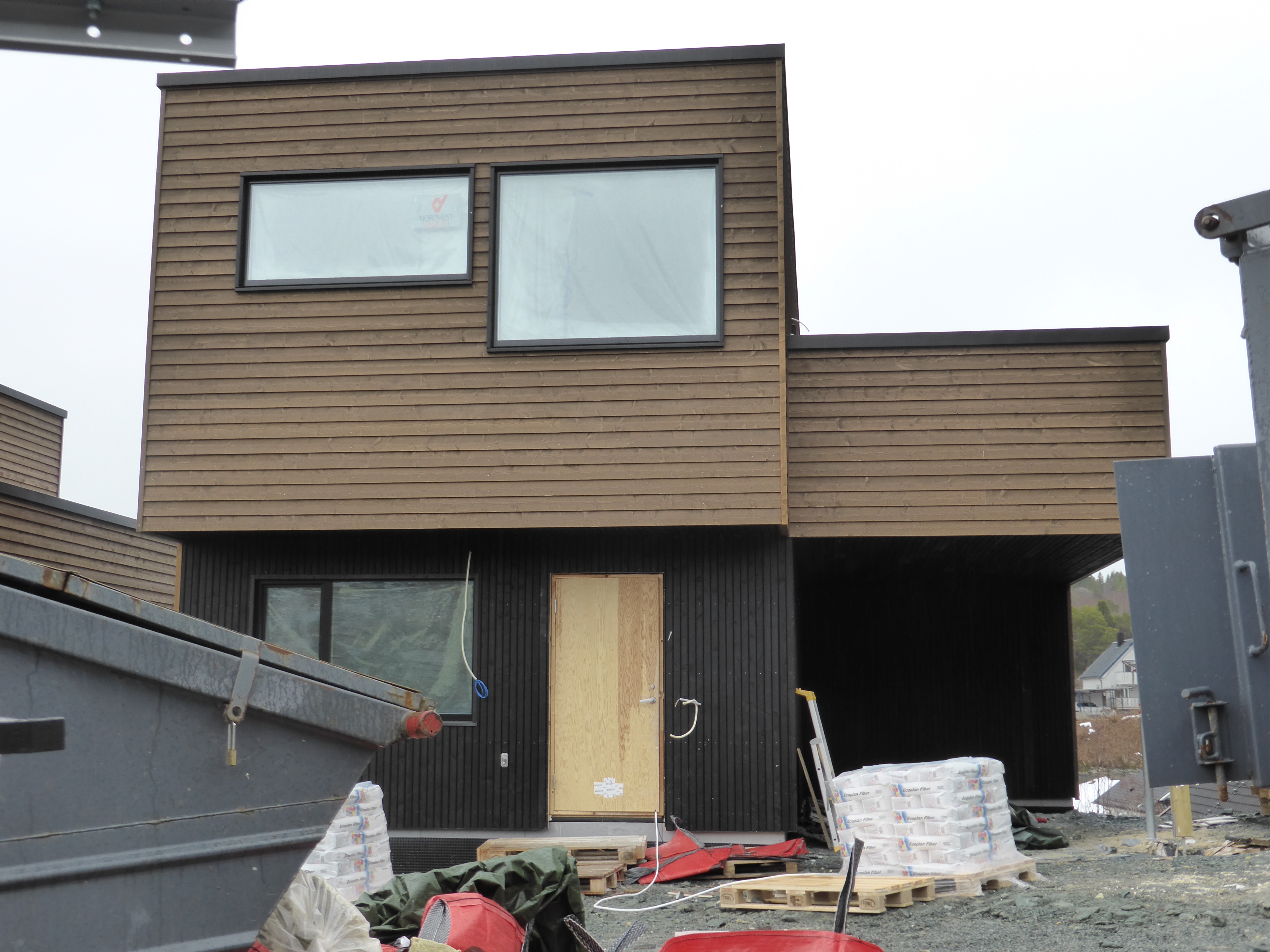 Ser ut som maling er påbegynt i 2.etg. Stod en utenfor å rensa malingssprøyte Ikke noe synlig endring i 1.etg enda, men det var på arbeidslys på soverommet mot vegen Lå en hel pall med avretningsmasse så da skal de vel i gang med gulvet i sokkelen